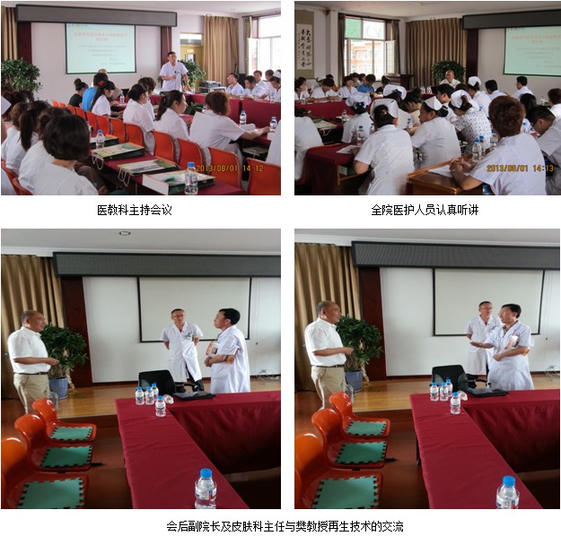2013年8月1日,中國(guó)中西醫(yī)結(jié)合學(xué)會(huì)燒傷專業(yè)委員會(huì)、北京燒傷創(chuàng)瘍研究所專家樊兆宗教授受邀來到了醫(yī)院進(jìn)行再生醫(yī)療技術(shù)培訓(xùn)。這次培訓(xùn)活動(dòng)由醫(yī)教科科長(zhǎng)主持會(huì)議,全院普外科、骨科、內(nèi)科、肛腸科等主要科室100多位醫(yī)護(hù)人員參加。結(jié)合醫(yī)院參加培訓(xùn)醫(yī)護(hù)人員科室分布的特點(diǎn),樊教授授課內(nèi)容主要包括以下二大部分:1、講述了我國(guó)著名生命科學(xué)家徐榮祥教授最新生命科學(xué)進(jìn)展,包括人體再生復(fù)原科學(xué)被納入美國(guó)發(fā)展國(guó)策等;2、近年來在人體再生復(fù)原科學(xué)研究領(lǐng)域所取得的重大臨床及實(shí)驗(yàn)研究成果,再生醫(yī)療技術(shù)治療各類難愈性創(chuàng)傷潰瘍創(chuàng)面、如糖尿病足、外科和骨科皮膚損傷潰瘍、手術(shù)切口感染、褥瘡、斷指再生等疾病如何實(shí)現(xiàn)了創(chuàng)面愈合且疤痕少、無功能障礙。其治療機(jī)理是什么?為什么要強(qiáng)調(diào)規(guī)范治療?各病種規(guī)范治療的要點(diǎn)等。講座期間,醫(yī)護(hù)人員都做了筆記,對(duì)再生醫(yī)療技術(shù)學(xué)習(xí)熱情高漲。