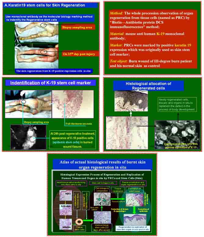 美國從脂肪組織中獲取干細(xì)胞的技術(shù)利用的就是我們的思路。凡是利用這種思路研究的結(jié)果,就都屬于我們中國人的發(fā)明,因?yàn)槲覀儞碛羞@項(xiàng)技術(shù)的專利權(quán),他們的研究是在看了我們的研究思路后才完成的。這就又形成一個(gè)定律:既然皮膚組織中能找出干細(xì)胞,那其他組織器官中也都能找出干細(xì)胞。而從器官組織中找到的干細(xì)胞的前身細(xì)胞是誰?這是這項(xiàng)科學(xué)體系的關(guān)鍵。在燒傷創(chuàng)面的研究中,我們確認(rèn)干細(xì)胞來源于原位的組織細(xì)胞,我們早已將其命名為“潛能再生細(xì)胞”,這是人體各器官、組織先天存在的再生潛能,所以形成了皮膚具有再生潛能,人體各器官、組織都具有再生潛能的再生定律。