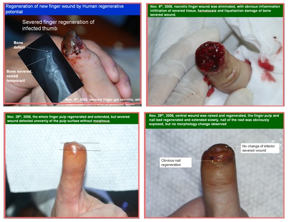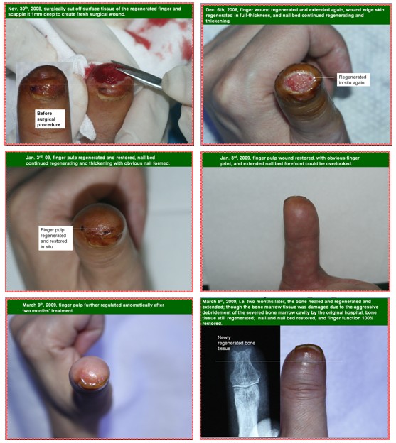 這是一個(gè)因外傷而斷指的患者6d~7d的創(chuàng)面。該指體離斷以后在醫(yī)院進(jìn)行了再植連接手術(shù),但沒有成活。而后來我們這里實(shí)施了原位再生復(fù)原斷指治療技術(shù),因?yàn)槭歉腥镜膭?chuàng)面,在22天時(shí),創(chuàng)面就提前封閉了,但指體沒有完全再生復(fù)原,缺少了一段。怎么辦?由于我們按照生命定律確認(rèn)所有器官里都有再生生命,重新再生的手指指體里仍然繼承了人體再生潛能的結(jié)構(gòu),我們相信這個(gè)斷指還能再生,所以我們重新截掉部分新再生的指體,形成新鮮的創(chuàng)面,再重新原位培養(yǎng)指體斷面,最后指體原位再生復(fù)原了。人體是由上皮組織、結(jié)締組織、肌肉組織、神經(jīng)組織這四大組織組成,現(xiàn)在含有這四大組織的斷指再生修復(fù)了,堅(jiān)信人體組織完全可實(shí)現(xiàn)原位再生復(fù)原。以上病例驗(yàn)證了人體又表達(dá)出了新的再生生命定律。