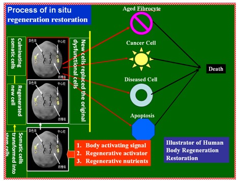 人在30歲以前,各器官、組織中的細(xì)胞維持在平衡狀態(tài),器官功能強(qiáng)壯,細(xì)胞功能旺盛,人體“基本生命”強(qiáng)盛。過了30歲,則人體器官和組織中的細(xì)胞開始出現(xiàn)相對平衡,細(xì)胞開始衰老,出現(xiàn)了正常生長的細(xì)胞、少量衰老的細(xì)胞與死亡細(xì)胞之間的相對平衡維持,器官功能正常,細(xì)胞功能相對旺盛,人體“基本生命”相對旺盛。人超過了40歲,衰老的細(xì)胞開始增多,衰老狀態(tài)細(xì)胞與生長狀態(tài)細(xì)胞幾乎處于相同的比例狀態(tài),此時(shí)尚且還能夠維持這種生長與衰老細(xì)胞及死亡細(xì)胞在數(shù)量上的平衡狀態(tài),但器官功能已經(jīng)開始下降,細(xì)胞功能也開始出現(xiàn)減退,人體“基本生命”開始出現(xiàn)衰弱表現(xiàn)。當(dāng)人超過了50歲,正常生長細(xì)胞越來越少,衰老細(xì)胞越來越多,人體衰老細(xì)胞的數(shù)目已經(jīng)超過了正常生長的細(xì)胞數(shù)目,此時(shí)衰老的細(xì)胞占了多數(shù),平衡狀態(tài)就被打破,并隨著年齡增長,人體細(xì)胞開始出現(xiàn)纖維化、疾病、異變及凋亡等現(xiàn)象,器官開始出現(xiàn)退行性改變,器官功能進(jìn)一步下降,細(xì)胞功能進(jìn)一步低下,人體“基本生命”也更加衰弱,當(dāng)這些細(xì)胞達(dá)到一定數(shù)量時(shí),會(huì)導(dǎo)致器官功能喪失,進(jìn)而人體死亡狀態(tài),人體“基本生命”終止。但如果啟動(dòng)人體潛能生命體的功能,人體一旦進(jìn)入再生復(fù)原后,上述“基本生命”的規(guī)律將發(fā)生改變,再生復(fù)原可以使人體“基本生命”得到保障和加強(qiáng),人體“基本生命”可以重新保持旺盛的生命活力。