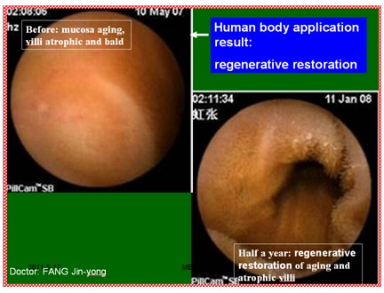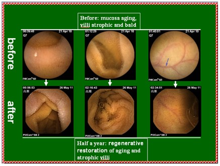 某會(huì)員,42歲,胃腸道衰老非常嚴(yán)重。養(yǎng)生前膠囊胃鏡表現(xiàn):小腸粘膜和粘膜下層明顯萎縮,變薄,粘膜下血管網(wǎng)及血管袢清晰可見,絨毛稀疏、增寬而短、斷裂、退化、部分區(qū)域絨毛脫落甚至脫失,隱窩深度變淺。整個(gè)胃腸黏膜系統(tǒng)呈現(xiàn)衰老狀態(tài)。養(yǎng)生一年后膠囊胃鏡表現(xiàn):小腸粘膜和粘膜下層明顯增厚,看不到粘膜下血管網(wǎng)及血管袢,絨毛濃密、長度增加,直徑增粗,沒有明顯斷裂、脫落、脫失的絨毛粘膜,隱窩變深。整個(gè)胃腸黏膜系統(tǒng)完全呈現(xiàn)為年輕健康的狀態(tài)。這個(gè)結(jié)果是當(dāng)前生命科學(xué)前沿所不能達(dá)到的。器官移植雖然可以,但移植本身是有缺陷的。