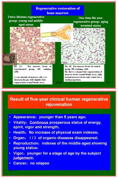 試驗(yàn)證明,大白鼠實(shí)現(xiàn)了2倍年齡不衰老,人體就能實(shí)現(xiàn)2倍年齡不衰老。我們對每個(gè)器官都進(jìn)行驗(yàn)證。試驗(yàn)結(jié)果:用300天雄性大白鼠,相當(dāng)于人類60歲,一組加再生物質(zhì)喂養(yǎng),一組不加再生物質(zhì)喂養(yǎng)。沒有加再生物質(zhì)喂養(yǎng)的老鼠,在一倍壽命(平均480天)時(shí)就衰老死亡了,器官組織學(xué)檢查確認(rèn)各器官都衰老于中年。而加入再生物質(zhì)喂養(yǎng)的老鼠活到兩倍壽命時(shí)還都活著,通過器官組織學(xué)檢查,各個(gè)器官都處于年輕狀態(tài)。目前,冠心病、腎臟,肺纖維化等疾病通過再生復(fù)原醫(yī)療技術(shù),按照人體再生生命定律,器官衰老難題都已經(jīng)解決了。