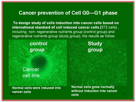 3T3細(xì)胞是美國NIH的測試致癌物質(zhì)的細(xì)胞,國際上就用這個(gè)細(xì)胞來測定一些物質(zhì)是否致癌?,F(xiàn)在我們用一個(gè)很簡單的實(shí)驗(yàn),就是用已確認(rèn)的致癌物質(zhì)誘導(dǎo)正常細(xì)胞變成癌細(xì)胞實(shí)驗(yàn)?zāi)P停由显偕镔|(zhì)后,3T3細(xì)胞誘導(dǎo)都不變成癌細(xì)胞。因?yàn)閺腉o期細(xì)胞內(nèi)各細(xì)胞器逐步增加,增加至一定水平后就會(huì)進(jìn)入G1期,G1期時(shí)細(xì)胞核會(huì)分裂產(chǎn)生新細(xì)胞,我們卻能夠阻止細(xì)胞進(jìn)入G1期(這是目前世界研究的空白),我們可以讓細(xì)胞在即將進(jìn)入G1期(細(xì)胞基因變化完成)時(shí)逆轉(zhuǎn),回到G0期,整個(gè)過程全部在人為的控制下(這個(gè)實(shí)驗(yàn)早在2001年便已經(jīng)完成)。這個(gè)控制依靠的是再生物質(zhì),用再生物質(zhì)量的關(guān)系控制這個(gè)途徑,不是用改變基因的物質(zhì)控制的。再生物質(zhì)量多和量少是不一樣的,量少則達(dá)不到啟動(dòng)再生程序要求。再生物質(zhì)的量決定了細(xì)胞內(nèi)細(xì)胞器的量,使得細(xì)胞器的代謝旺盛,所以我們的結(jié)論是用細(xì)胞代謝來控制生命,用控制細(xì)胞的代謝實(shí)現(xiàn)了人體的再生。而不是用改變細(xì)胞屬性的方法來控制生命,我們一直的觀念就是“任何改變生命屬性的研究都是反人類的”。這是我們對癌癥的研究情況,癌癥已變得很簡單,而其他人把研究癌的方向集中到細(xì)胞核里的遺傳物質(zhì)去了,研究方向搞錯(cuò)了。