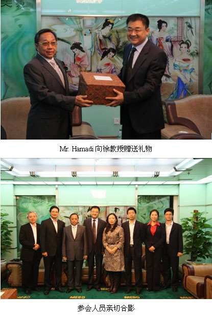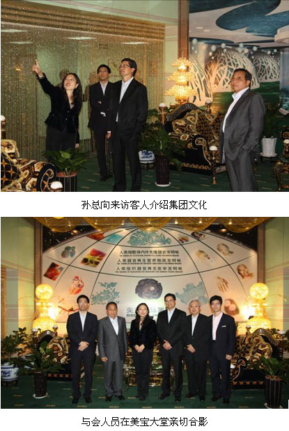 10月22日上午,美寶國際集團(tuán)董事局主席徐榮祥教授在集團(tuán)貴賓室親切會見Mr. Hamadi一行將本次訪問活動推向了高潮。徐教授表示美寶印尼市場一直以來都是美寶集團(tuán)最為關(guān)注的市場區(qū)域之一,對雙方所達(dá)成的五年規(guī)劃、新產(chǎn)品發(fā)展計(jì)劃及新的合作模式表示祝賀,并向客人全面通報(bào)了近年來美寶在癌癥研究及再生會所等方面取得的重大進(jìn)展,并提出印尼將是美寶人體再生復(fù)原俱樂部全球推廣計(jì)劃的基地之一。Mr. Hamadi首先對于徐教授的介紹表示感謝,對于美寶在癌癥研究方面取得的成就表示祝賀,同時(shí)對于徐教授提出的計(jì)劃連聲表示贊同,希望回到印尼后能夠盡快啟動這項(xiàng)計(jì)劃,希望自己盡快在印尼享受到人體再生復(fù)原技術(shù)帶來的養(yǎng)生效果。