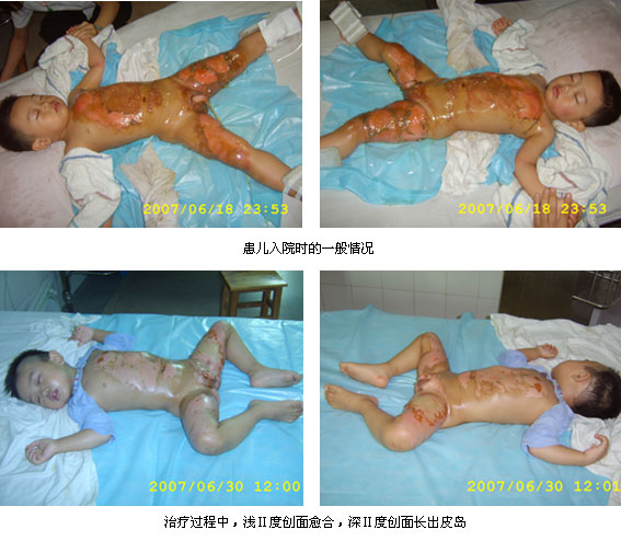 2007年6月18日下午3時,廣州花都中醫(yī)院燒傷外科急診收入一例小兒大面積燒傷患兒。該患兒男性,1歲11個月。以“熱液燙傷全身多處并疼痛滲液1小時”為主訴急診入院。入院時體查示:左側面頸部、胸前壁、腹壁、會陰部、雙側大腿創(chuàng)面可見散在大小不等的水皰,部分腐皮破潰,創(chuàng)基紅白相間或蒼白色,滲液較多,觸痛明顯。入院診斷:熱液全身多處燙傷Ⅱ-Ⅲ度總面積28%TBSA(淺Ⅱ度8%、深Ⅱ度15%、淺Ⅲ度5%);患兒入院后該院立即請求中國中西醫(yī)結合學會燒傷專委會常委、北京燒傷創(chuàng)瘍研究所副所長、臨床研究部主任王洪生為患兒會診。王主任到達該院并查看患兒后、立即與燒傷外科主任雷震及主管醫(yī)生萬志強共同為患兒制定了適宜的救治方案,即對患兒創(chuàng)面處理采用外涂美寶濕潤燒傷膏行濕潤暴露療法,全身治療采用抗休克、抗感染、營養(yǎng)支持及臟器功能維護等綜合措施。經(jīng)二十余天積極有效的治療,患兒平穩(wěn)渡過了休克關、感染關,左側面頸部、胸腹部、右側大腿淺Ⅱ度、深Ⅱ度及左側大腿、會陰部、陰莖處淺Ⅲ度創(chuàng)面已基本生理性愈合。