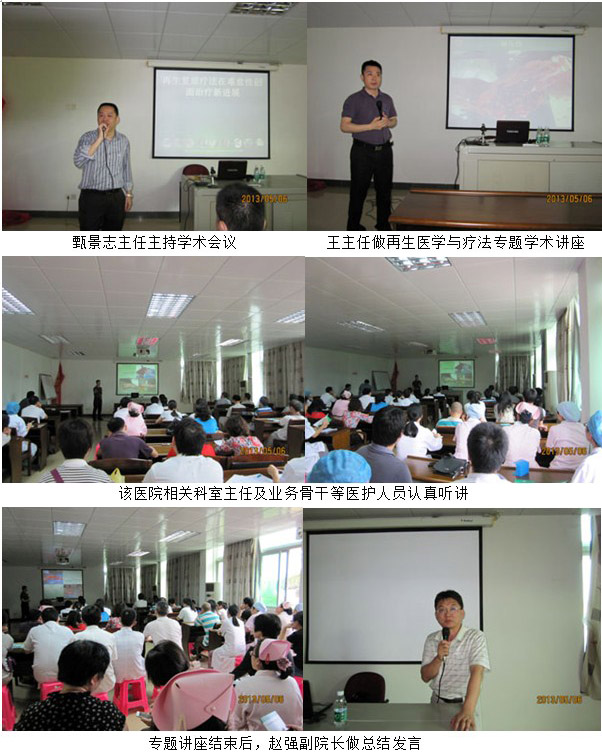 2013年12月6日上午8時(shí),中國(guó)燒傷創(chuàng)瘍雜志副總編輯、中國(guó)中西醫(yī)結(jié)合學(xué)會(huì)燒傷專業(yè)委員會(huì)常委兼秘書(shū)、北京美寶燒傷創(chuàng)瘍研究所副所長(zhǎng)、臨床研究部主任王洪生研究員應(yīng)邀來(lái)到臺(tái)山市中醫(yī)院外科病房,在科主任和主管醫(yī)生的陪同下對(duì)多例創(chuàng)傷潰瘍、糖尿病足、靜脈淤血性潰瘍、皮膚癌、褥瘡、手術(shù)切口感染等住院患者進(jìn)行會(huì)診及教學(xué)查房。9點(diǎn)10分,來(lái)到門(mén)診大廳,開(kāi)展專家義診活動(dòng)。11點(diǎn)左右,王主任不辭辛苦,在科主任和業(yè)務(wù)院長(zhǎng)的陪同下再次來(lái)到外科病房,對(duì)兩例典型病例患者做教學(xué)式清創(chuàng)換藥。下午3點(diǎn),在該醫(yī)院學(xué)術(shù)會(huì)議廳再次舉辦了臺(tái)山市“皮膚再生醫(yī)療技術(shù)在慢性難愈性創(chuàng)面創(chuàng)面治療新進(jìn)展”專題講座,學(xué)術(shù)講座開(kāi)始后,首先由該醫(yī)院創(chuàng)瘍血管外科主管醫(yī)生陳強(qiáng)做了“皮膚再生醫(yī)療技術(shù)在中醫(yī)院臨床運(yùn)用實(shí)踐和體會(huì)”的講座,隨后王主任做了專題為“皮膚再生醫(yī)療技術(shù)在慢性創(chuàng)瘍創(chuàng)面治療新進(jìn)展”的學(xué)術(shù)報(bào)告。會(huì)議由外科甑主任和趙付院長(zhǎng)主持,中醫(yī)院及臺(tái)山各鄉(xiāng)鎮(zhèn)醫(yī)院領(lǐng)導(dǎo)和相關(guān)科室骨干150多名醫(yī)護(hù)人員參加了學(xué)術(shù)講座。王主任重點(diǎn)講述了1,我國(guó)著名生命科學(xué)家、醫(yī)學(xué)家徐榮祥教授近年來(lái)在人體再生復(fù)原科學(xué)研究領(lǐng)域所取得的重大臨床及實(shí)驗(yàn)研究成果,以及再生復(fù)原療法的概念及其解決難愈性創(chuàng)面治療的機(jī)理;2,介紹了再生復(fù)原療法創(chuàng)面規(guī)范的處理方法 ;3,重點(diǎn)講述了再生復(fù)原療法在各類難愈性創(chuàng)瘍創(chuàng)面治療要點(diǎn)及典型病例介紹,并結(jié)合大量的病例圖片講解了各類深度燒傷創(chuàng)面、再生醫(yī)療技術(shù)在骨外露、鋼板外露、糖尿病足、動(dòng)脈閉塞癥、撕脫傷、斷肢再生、手術(shù)切口感染、褥瘡等各種難愈合創(chuàng)面的治療過(guò)程及要點(diǎn)。學(xué)術(shù)報(bào)告持續(xù)到6點(diǎn)才結(jié)束。學(xué)術(shù)講座結(jié)束后,主管副院長(zhǎng)趙強(qiáng)做了總結(jié)發(fā)言,會(huì)后,該醫(yī)院院長(zhǎng)陳誼武親自到會(huì)對(duì)王主任表示感謝,他還特別強(qiáng)調(diào),2003年他曾經(jīng)到廣州參加皮膚再生醫(yī)療技術(shù)學(xué)習(xí)班,今天聽(tīng)到的和看到的是該項(xiàng)技術(shù)又在慢性難愈性創(chuàng)面有了那么多新進(jìn)展,本次學(xué)術(shù)交流非常有意義,之后王主任應(yīng)邀與陳誼武、院長(zhǎng)、趙強(qiáng)副院長(zhǎng)、創(chuàng)瘍血管外科主任甄景志等領(lǐng)導(dǎo)、專家合影留念。通過(guò)本次,義診、教學(xué)查房、會(huì)診、學(xué)術(shù)講座臺(tái)山市電視臺(tái)等新聞媒體全程進(jìn)行了采訪報(bào)道,起到了在臺(tái)山市進(jìn)一步深入推廣、普及皮膚再生醫(yī)療技術(shù)的作用。