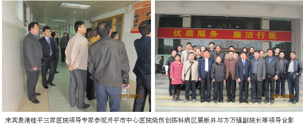 為打造優(yōu)勢(shì)???,在中國(guó)中西醫(yī)結(jié)合學(xué)會(huì)燒傷專業(yè)委員會(huì)常委、中國(guó)燒傷創(chuàng)瘍雜志副總編輯、北京燒傷創(chuàng)瘍研究所副所長(zhǎng)、臨床研究部王洪生主任的精心安排下,廣西來(lái)賓市中醫(yī)醫(yī)院、貴港市中醫(yī)醫(yī)院、桂平市中醫(yī)醫(yī)院三家醫(yī)院的院長(zhǎng)親自掛帥,帶領(lǐng)院級(jí)領(lǐng)導(dǎo)及相關(guān)科室主任、護(hù)理部主任、護(hù)士長(zhǎng)和相關(guān)專業(yè)專家一行36人于2011年3月20日上午9時(shí),齊聚廣東省開平市中心醫(yī)院,拉開了兩廣多家醫(yī)院跨省區(qū)考察和臨床學(xué)術(shù)交流的序幕。