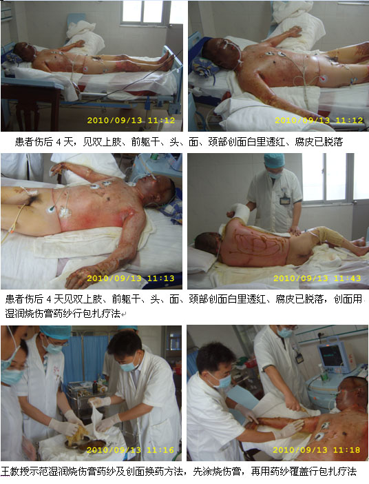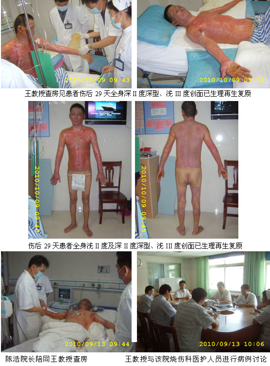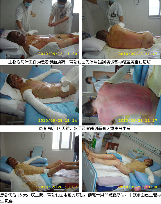 2010年9月11日,惠陽區(qū)第一人民醫(yī)院收治了1例煤氣火焰燒傷的患者,燒傷深度為Ⅱ度~Ⅲ度燒傷,全身燒傷總面積達65%TBSA,大部分創(chuàng)面為深Ⅱ度深型和淺Ⅲ度創(chuàng)面。該院燒傷科主管醫(yī)生認為該患者必需進行切削痂植皮手術,手術需要8名醫(yī)生參與,由于該院燒傷整形科剛剛與手足顯微外科合并,無法進行切痂植皮手術,主治醫(yī)師主張轉到上級醫(yī)院治療。該科主任葉琪毅立即組織該科醫(yī)護人員進行病例討論,并認真參閱《燒傷治療大全》,他認為該患者完全可以采用燒傷皮膚原位再生復原醫(yī)療技術治療,并立即向院領導匯報了患者的傷情和自己的想法。該院主管院長指示,患者不能治不了就轉院,該院主管院長和院長均指示馬上邀請中國中西醫(yī)結合學會燒傷專業(yè)委員會常委、北京美寶燒傷創(chuàng)瘍研究所副所長、臨床研究部主任王洪生教授到該院會診并指導該患者的救治工作。中國中西醫(yī)結合學會燒傷專業(yè)委員會王教授剛剛結束在云南文山州召開的2010度云南省第二屆中西醫(yī)結合學會燒傷專業(yè)委員會第三次燒傷創(chuàng)瘍學術年會,在接到該院葉主任的電話,得知患者的情況后,王主任先就有關該大面積深度燒傷患者救治方法進行了電話指導,當晚王教授立即從云南昆明經(jīng)廣州趕赴廣東惠陽指導該患者的救治工作。