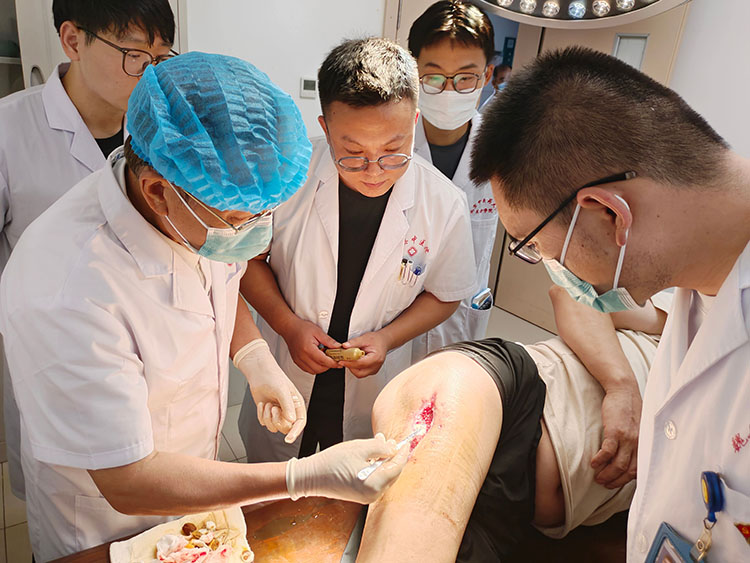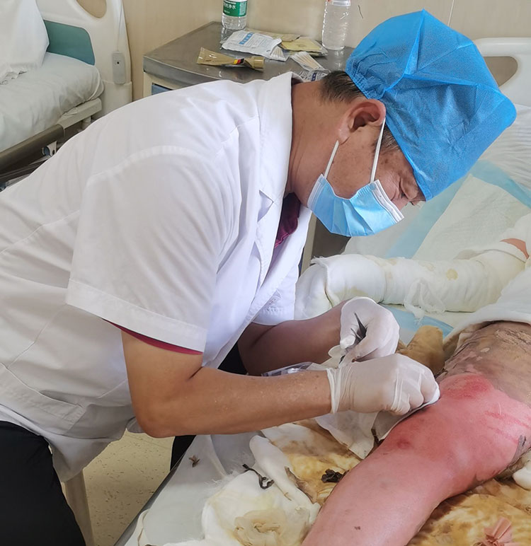 8月18日,應(yīng)河北魏縣中醫(yī)醫(yī)院之邀,再生醫(yī)學(xué)知名專(zhuān)家、《中國(guó)燒傷創(chuàng)瘍雜志》常務(wù)編委趙瑞慶主任,在該院會(huì)診了三例創(chuàng)面患者(下肢外傷皮膚深部感染、腦出血合併巨大壓瘡、肢體多部位瀝青燒傷),并親自演示了操作程序,在討論環(huán)節(jié)提供了一對(duì)一的治療方法。
