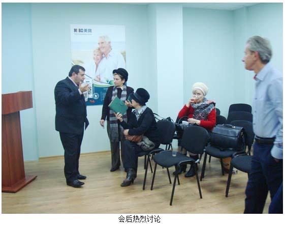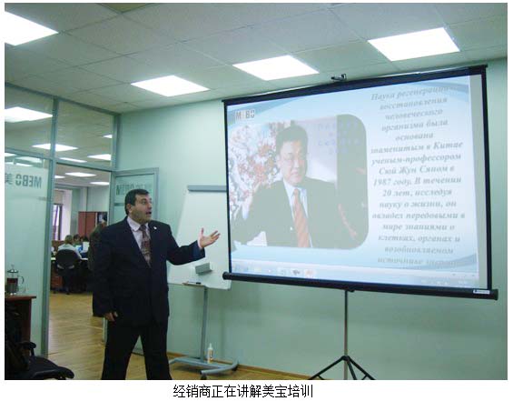 11月20日國(guó)際市場(chǎng)集團(tuán)總裁班子委員, 市場(chǎng)部總經(jīng)理劉鋼專程來(lái)莫斯科了解指導(dǎo)市場(chǎng)開發(fā)工作,并協(xié)調(diào)解決產(chǎn)品物流問(wèn)題。借總部領(lǐng)導(dǎo)來(lái)臨的東風(fēng),分公司一周內(nèi)舉辦了兩場(chǎng)小型公司招商說(shuō)明會(huì),宣講美寶公司的歷史和發(fā)展,人體原位再生復(fù)原科學(xué)技術(shù)和產(chǎn)品應(yīng)用,美寶直銷業(yè)務(wù)帶來(lái)的健康財(cái)富機(jī)會(huì),一些參會(huì)人對(duì)美寶再生科學(xué)和產(chǎn)品的神奇效果所震驚,在會(huì)后就直接報(bào)單購(gòu)買加入美寶。