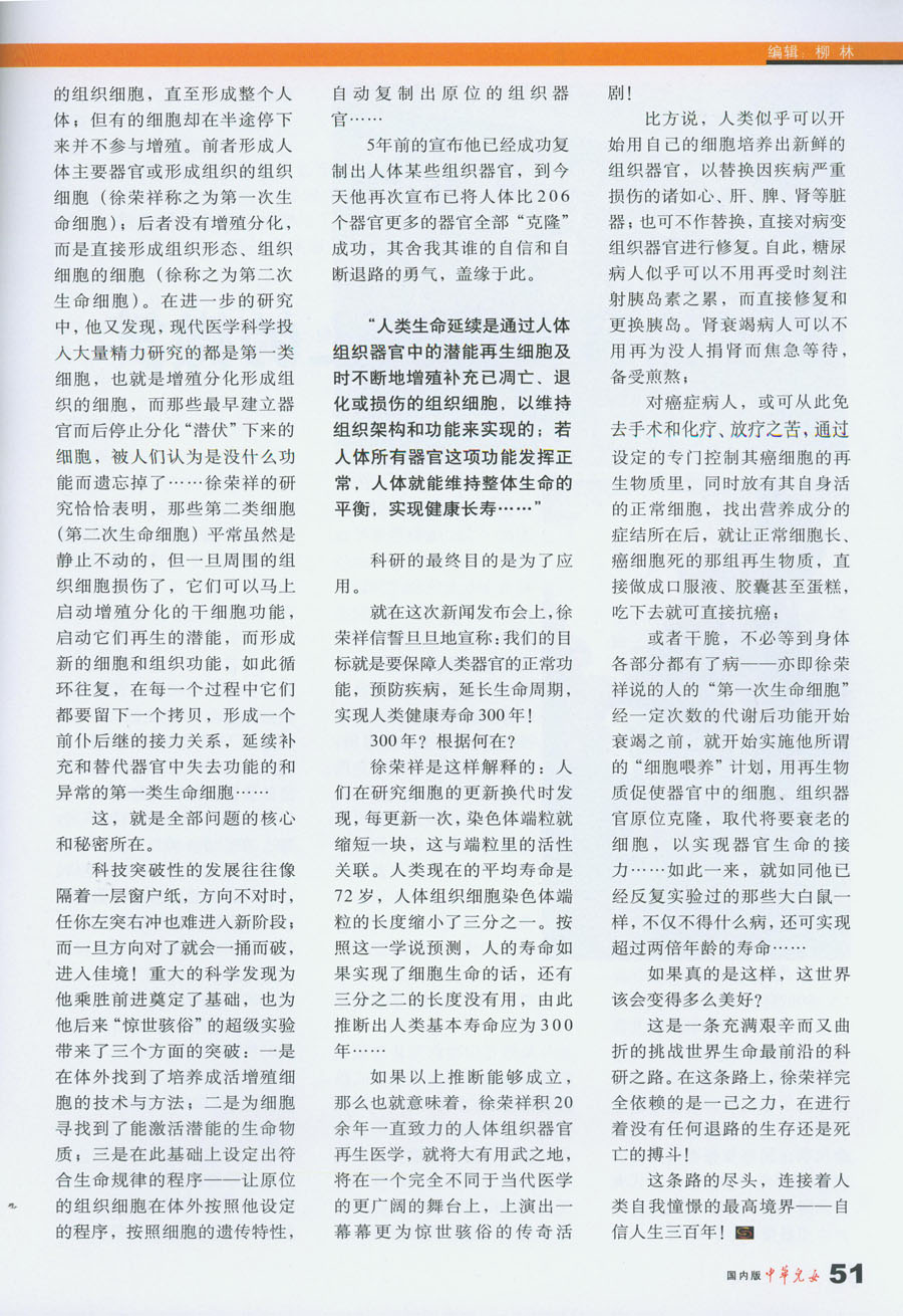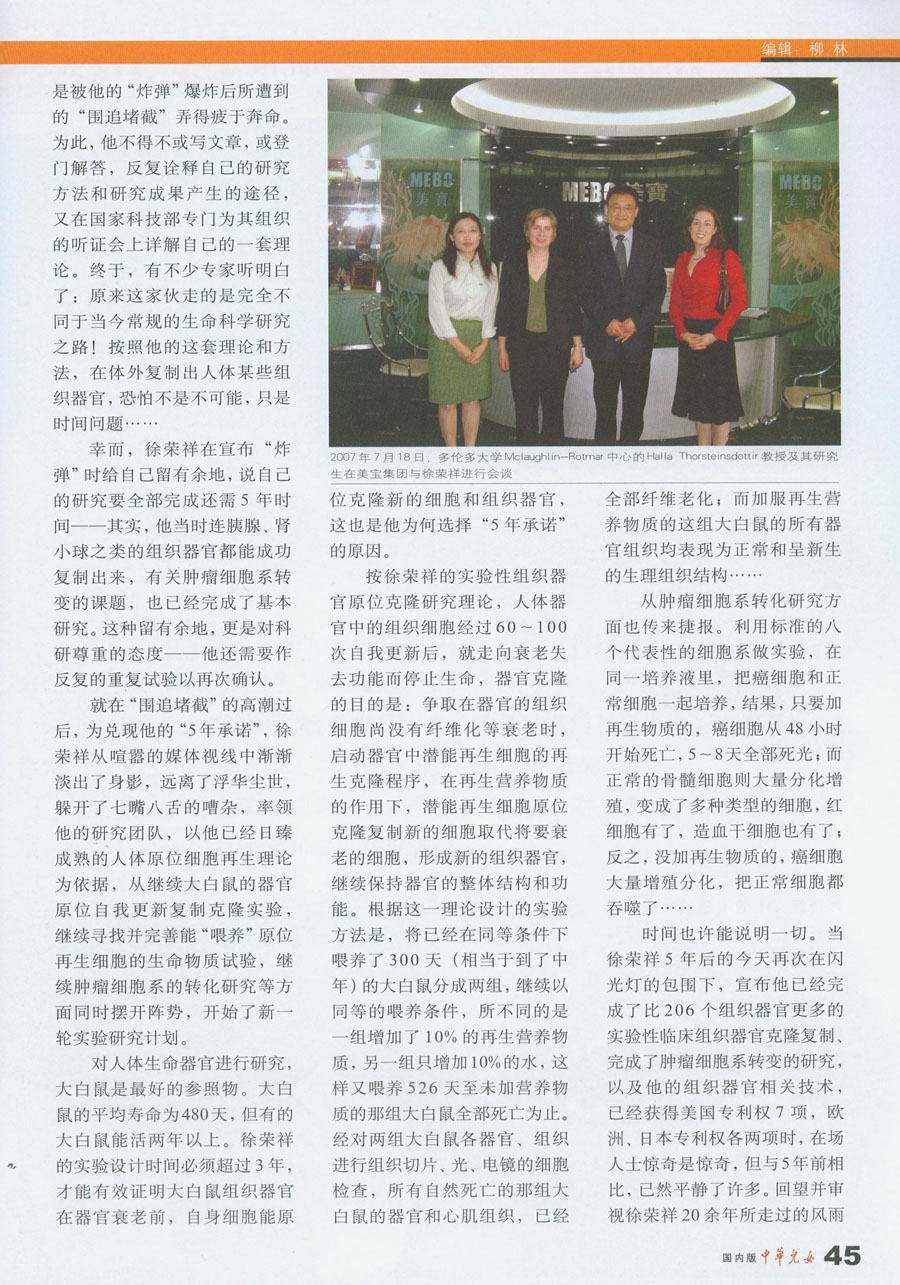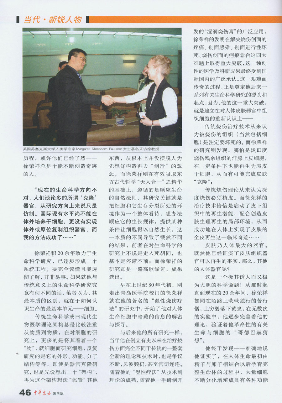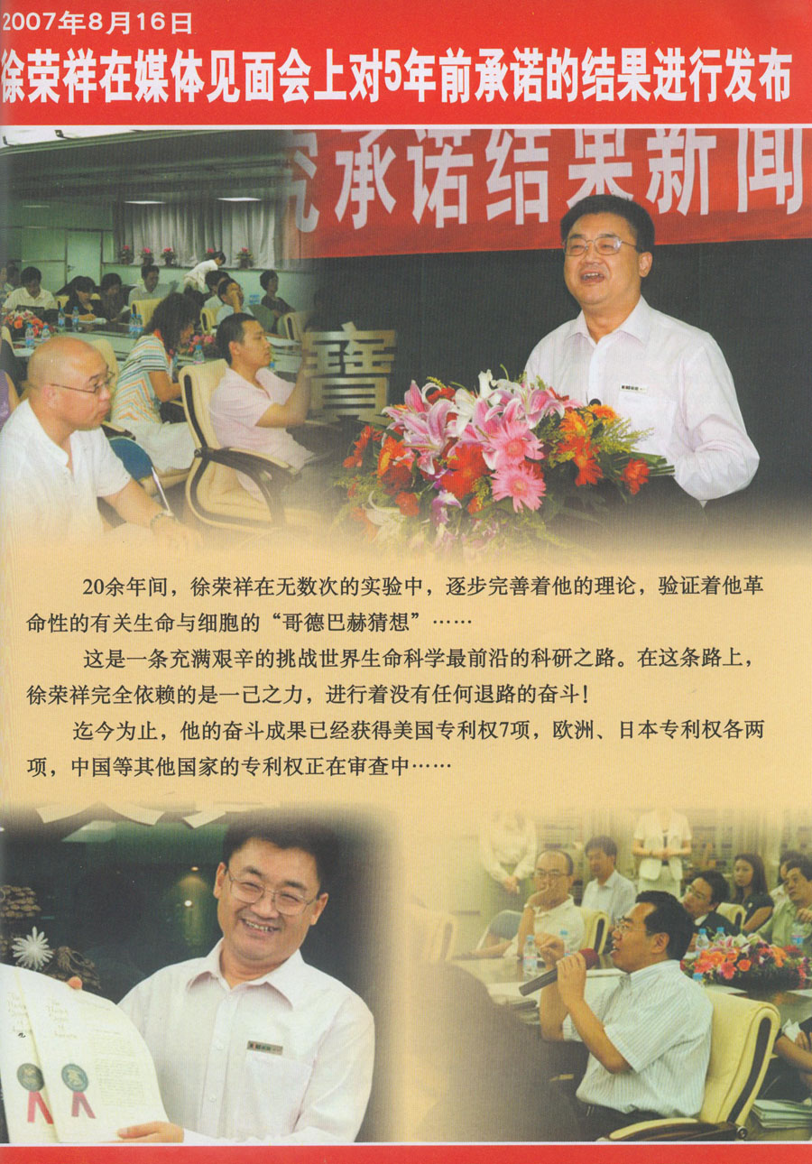 2002年8月1 6日,備受爭議的醫(yī)學(xué)科學(xué)工作者徐榮祥教授通過媒體宣布,他和他的研究團(tuán)隊(duì)經(jīng)數(shù)年努力.在人體原位和體外成功復(fù)制出了組織器官!同時(shí)宣布,將用5年時(shí)間“克隆”出人體所有組織器官.同時(shí)破解癌癥之謎!這一爆炸性的新聞,震驚了醫(yī)學(xué)科學(xué)界,一時(shí)間質(zhì)疑聲四起。同年的《中華兒女》第1 0期上,就以《驚世駭俗徐榮祥》為題,詳細(xì)報(bào)道了他別辟蹊徑的生命科學(xué)研究之路。