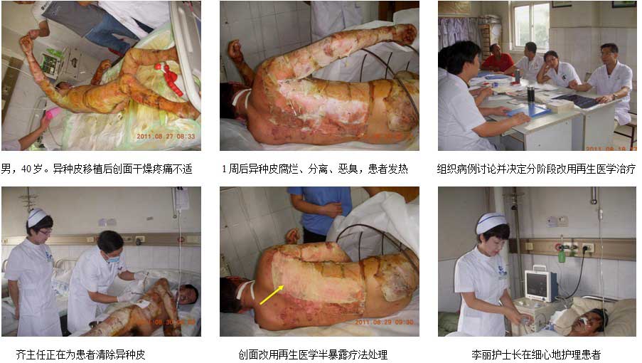 今天通過電話和齊主任及劉柱醫(yī)師聯(lián)系獲悉:1、20歲70%TBSA燒傷的患者在規(guī)范系統(tǒng)的再生醫(yī)學治療下,創(chuàng)面已經(jīng)愈合了67%TBSA,目前右肩部3%TBSA的深II度深型創(chuàng)面正在逐步愈合,患者今天出院改門診治療,住院費用5萬多元;2、40歲70%TBSA燒傷傳統(tǒng)異種皮移植患者,正在逐步清除異種皮,早期改用再生醫(yī)學技術處理的創(chuàng)面已經(jīng)再生愈合;3,其他患者的情況都比較好,部分患者已治愈出院;4、近期又來了2例大面積燒傷的患兒,正在采用再生醫(yī)學技術進行治療。