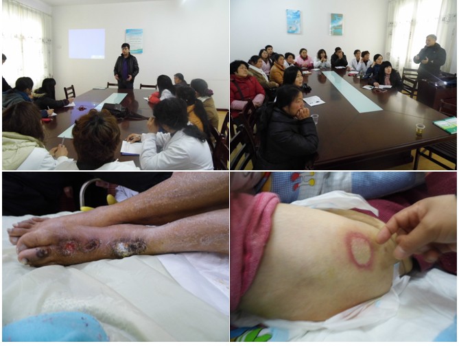 在三樓的會議室,郭院長召集了全體護理人員進行培訓,并要求大家認真聽講,珍惜這次難得的機遇,黃岡區(qū)域人員高偉介紹了金黨軍主任的學術背景以及再生醫(yī)療技術在實踐中的重大意義;金主任為學員們準備了通俗易懂便于實際操作的課件,有針對性的結合重點病例,講解了再生醫(yī)療技術在壓瘡、糖尿病足等慢性難治性皮膚潰瘍治療方面的原則和換藥方法,回答了學員們的各種提問。最后,在郭院長的陪同下,金主任到各個樓層為幾位患病老人會診,現(xiàn)場講解治療換藥時需要注意的事項和方法。