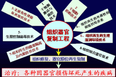 我們對(duì)干細(xì)胞的研究方法剛才己講過了,不是在體外而是在體內(nèi)或在組織上,并且是原位,只有原位培植干細(xì)胞才更直接,更實(shí)際。在經(jīng)歷了多年的研宄和實(shí)踐之后,規(guī)劃出了由八大技術(shù)工程共同完成的人類組織器官再生復(fù)制的程序圖,今天僅是初步公布。因?yàn)槟壳皣?guó)內(nèi)外的研究尚未進(jìn)行到這一步,故可視為是里程碑式的發(fā)展。這個(gè)程序圖在夏威夷國(guó)際會(huì)上僅展示了一遍,代表們均認(rèn)同其創(chuàng)新性。(附原位干細(xì)胞組織器官再生復(fù)制技術(shù)組合圖)