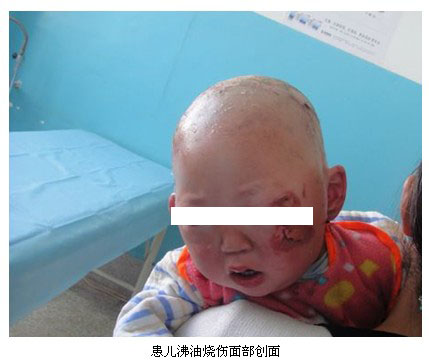 樂(lè)陵市人民醫(yī)院燒傷科于2011年4月25日接收了1名頭皮沸油燒傷小兒患者,該院高院長(zhǎng)、燒傷科吳主任非常重視,與燒傷科魯國(guó)軍醫(yī)生一同為患兒采用再生醫(yī)療技術(shù)治療,治療1天后,該患兒兩眼瞼腫脹,頭皮創(chuàng)面蒼白,痂皮硬,小兒哭鬧。北京市燒傷創(chuàng)瘍研究所醫(yī)療部專(zhuān)家王廣順教授當(dāng)時(shí)正在濟(jì)南106醫(yī)院為蒙古國(guó)右足凍傷小伙治療,在接到該院領(lǐng)導(dǎo)的邀請(qǐng)后立即與徐亞磊同志一起乘車(chē)趕到該院進(jìn)行技術(shù)指導(dǎo)。下午6點(diǎn),王廣順教授在該院燒傷科吳主任、魯大夫及護(hù)士長(zhǎng)的陪同下來(lái)到病房,見(jiàn)患兒年齡僅10個(gè)月,沸油燒傷頭面、臀部,燒傷總面積23%TBSA。王廣順教授親自應(yīng)用再生復(fù)原醫(yī)療技術(shù)為患者換藥,頭皮Ⅲ度創(chuàng)面采用“耕耘療法”,通過(guò)涂藥等局部治療后,又進(jìn)一步調(diào)整了全身治療方案。次日換藥治療時(shí)察看該患兒頭皮Ⅲ度創(chuàng)面,已見(jiàn)耕耘處紅暈、新鮮有彈性。