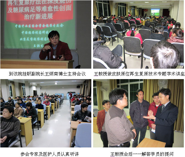 在學(xué)術(shù)講座中,王教授首先向與會醫(yī)護(hù)人員介紹了我國著名生命科學(xué)家、醫(yī)學(xué)家徐榮祥教授在人體再生復(fù)原科學(xué)領(lǐng)域取得的實驗及臨床研究最新進(jìn)展,在2010年年底公布的“人體生命延續(xù)之謎(二)——線粒體主導(dǎo)日常生命”,破解了“精、氣、神、力”旺盛與人體啟動了再生生命程序有關(guān),與細(xì)胞內(nèi)各主要細(xì)胞器功能的發(fā)揮有關(guān),并進(jìn)一步證實了一個生命體可以同時具有“基本生命”和“再生生命”等,接下來王教授結(jié)合了大量的臨床病例圖片,針對不同深度的燒傷創(chuàng)面及各類難愈性創(chuàng)傷、潰瘍創(chuàng)面的規(guī)范化處理方法與技巧、注意事項等進(jìn)行了細(xì)致地講解,著重講了再生療法在糖尿病足及其他難愈性創(chuàng)傷、創(chuàng)面中的應(yīng)用,特別介紹了該項技術(shù)已經(jīng)在各地醫(yī)院大量應(yīng)用于臨床,并且取得了非常好的療效,與會的醫(yī)護(hù)人員看到大量真實的臨床病例資料圖片后,都被皮膚原位再生復(fù)原技術(shù)良好的治愈效果所震撼。這次講座一直持續(xù)到晚上9時40分結(jié)束。