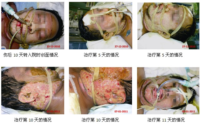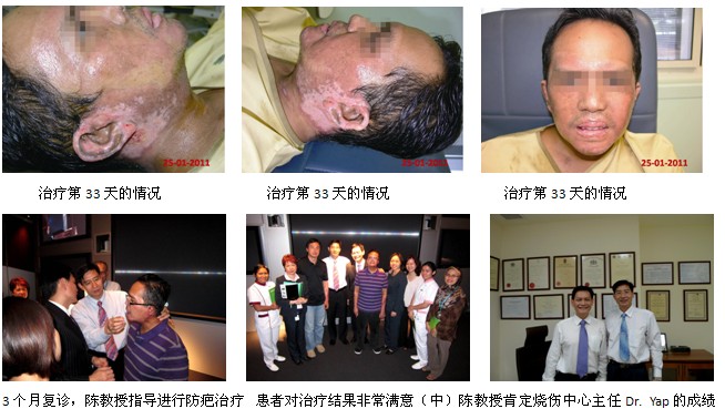2010年11月,醫(yī)院收治了一例從外院轉(zhuǎn)來的汽油深度燒傷合并并嚴(yán)重吸入性損傷的患者(TBSA=22%,深I(lǐng)I度—淺III度),該患者是一名29歲的工程師,是在工作中被燒傷的,且燒傷部位主要集中在頭面部和雙上肢等重要功能部位和影響容貌的部位。為了使患者得到更好的恢復(fù)容貌和肢體的功能,醫(yī)院決定采用再生醫(yī)學(xué)技術(shù)治療治療這例大面積嚴(yán)重?zé)齻颊?,同時(shí),為了更有把握地救治好該患者,燒傷整形中心的主任Dr. Yap Lok Huei馬上與中國燒傷創(chuàng)瘍科技中心的陳永翀主任取得了聯(lián)系,陳教授通過電話和電子郵件對該患者進(jìn)行了治療指導(dǎo),醫(yī)院燒傷中心的醫(yī)護(hù)人員全程采用燒傷再生醫(yī)學(xué)技術(shù)對患者進(jìn)行規(guī)范的治療。經(jīng)過33天的規(guī)范治療,患者的所有深度燒傷創(chuàng)面不需要植皮全部實(shí)現(xiàn)燒傷皮膚原位再生愈合的臨床效果。以下是頭、面、頸部深度燒傷早期的再生愈合情況和愈合后3個(gè)月隨訪的情況: